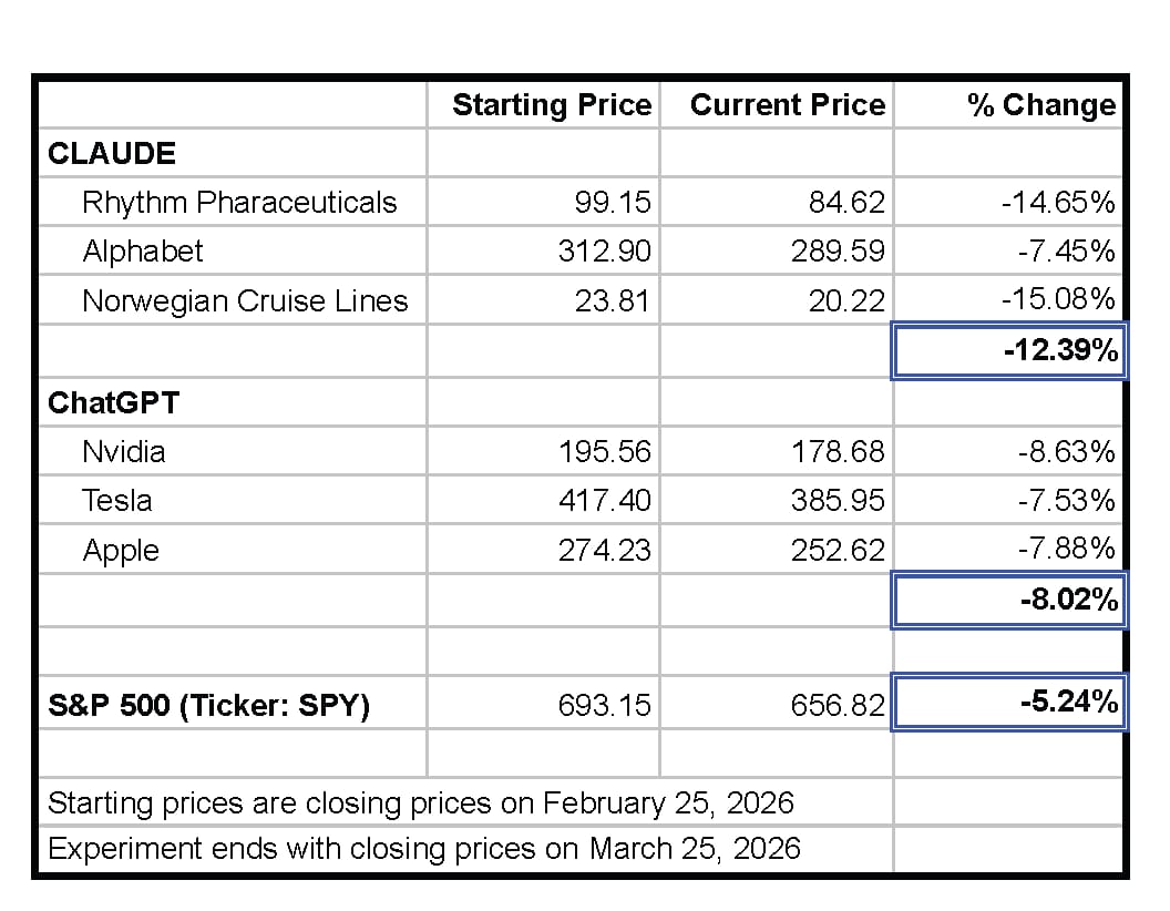 Not so fast. In the same time period, the ChatGPT portfolio was down 8.0% and the Claude portfolio was down 12.4%.