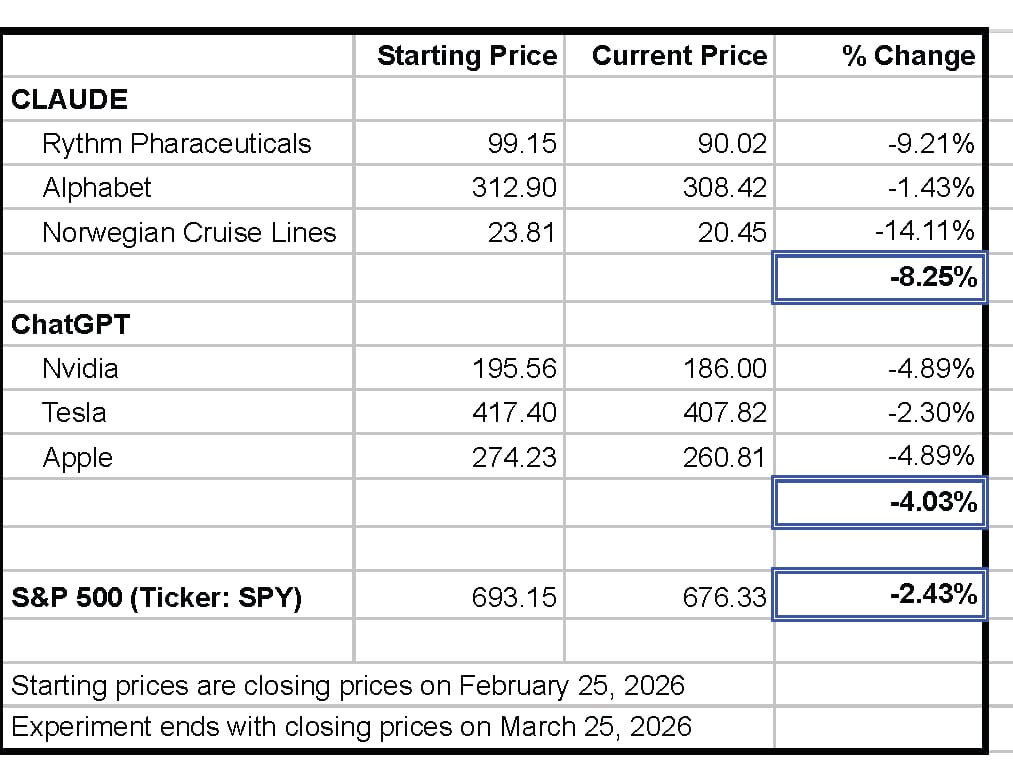 Here is where things stand two weeks into the four-week test. Current prices are closing prices on 11-March-2026.